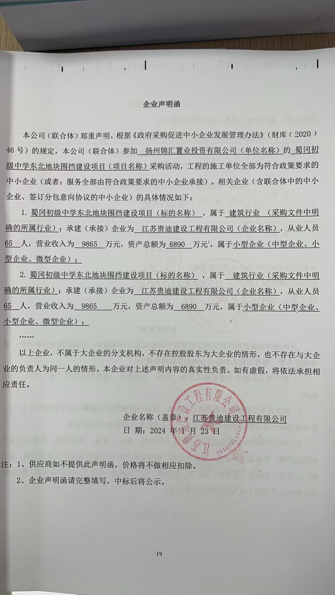 五、評審專家名單:董冰、郁偉、吳呈盛 六、公告期限 自本公告發(fā)布之日起1個工作日。 七、其他補(bǔ)充事宜 無 八、凡對本次公告內(nèi)容提出詢問,請按以下方式聯(lián)系。 1.采購人信息 名 稱:揚(yáng)州錦匯置業(yè)投資有限公司 2.采購代理機(jī)構(gòu)信息 名 稱:揚(yáng)州筑苑工程招標(biāo)咨詢有限公司 地 址:揚(yáng)州潤揚(yáng)北路19號 聯(lián) 系 人:李斌 聯(lián)系電話:0514-87116778 3.項目聯(lián)系方式 項目聯(lián)系人:李斌 電 話:0514-87116778 揚(yáng)州筑苑工程招標(biāo)咨詢有限公司 2024年1月24日 中小企業(yè)聲明函.jpg